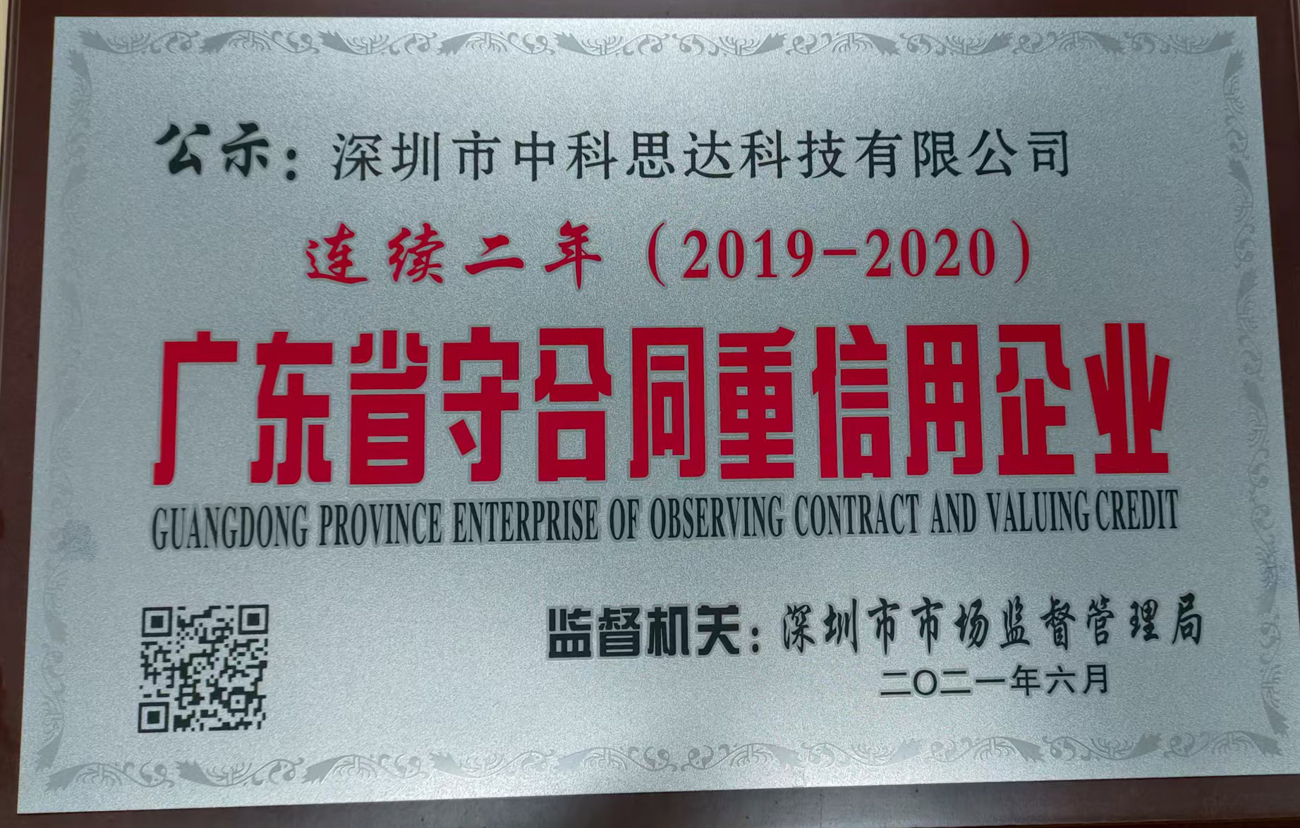 2021年6月连续两年获得“广东省守合同重信用企业”称号