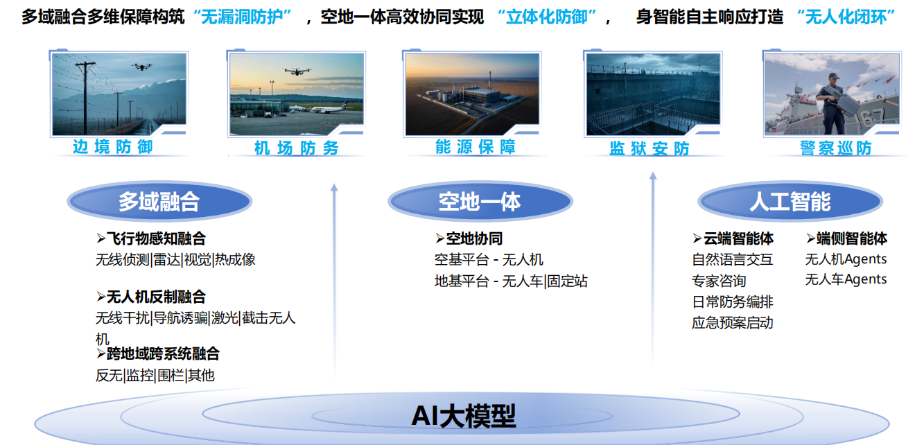 多域融合多维保障构筑“无漏洞防护”,空地一体高效协同实现“立体化防御”,身智能自主响应打造“无人化闭环”;
