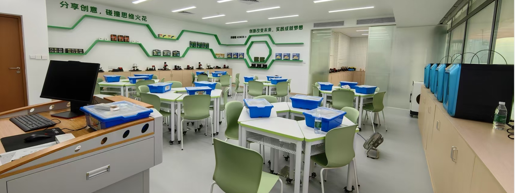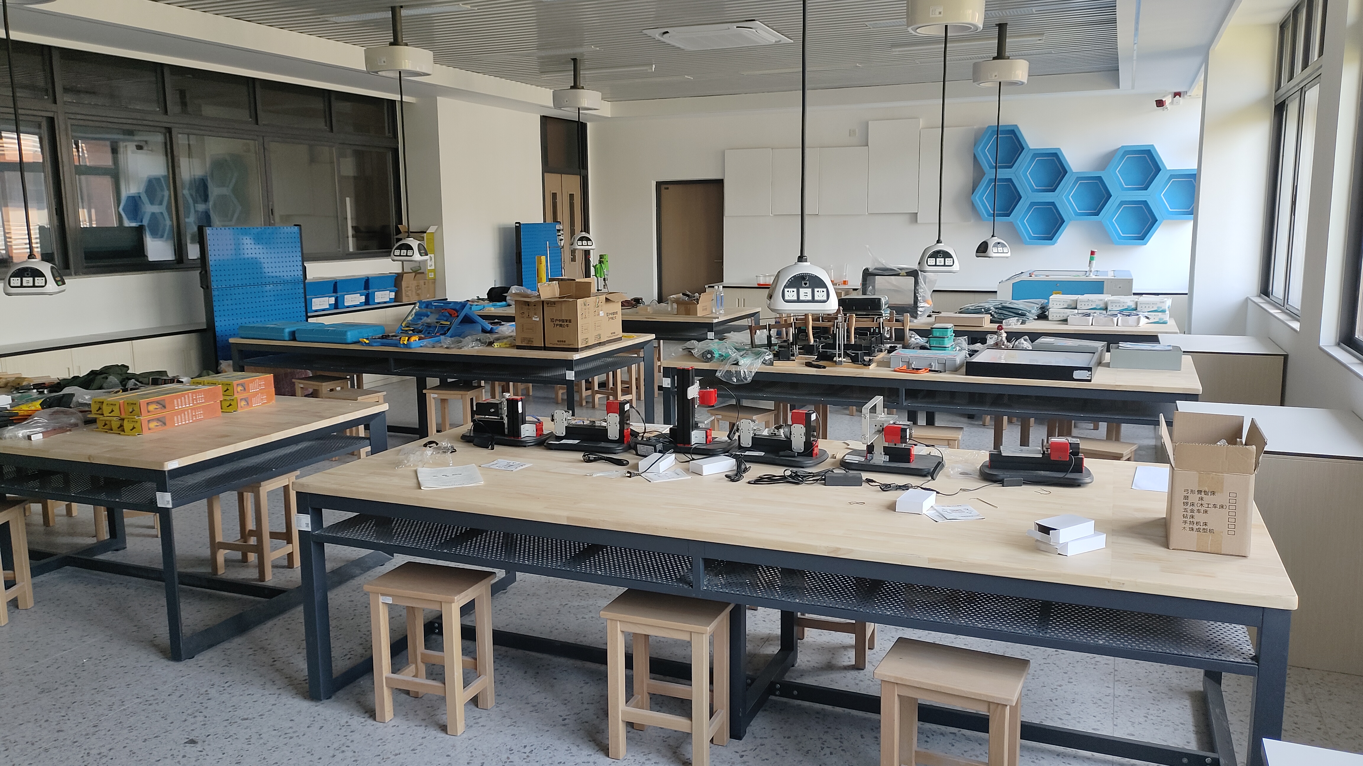 协作区布置有简洁的桌椅,固定的排列方式既保留了整体讨论的开放空间,也自然划分出几个独立的小区域供不同小组使用。学生们可以把自己的半成品、设计草图或者遇到的难题带到这里,与同伴们围坐在一起交流。大家各抒己见,分享自己的加工经验,探讨解决问题的方法,在思想的碰撞中,不仅能找到更好的创作思路,还能加深对金工木工技艺的理解,让整个创作过程更具乐趣和意义。